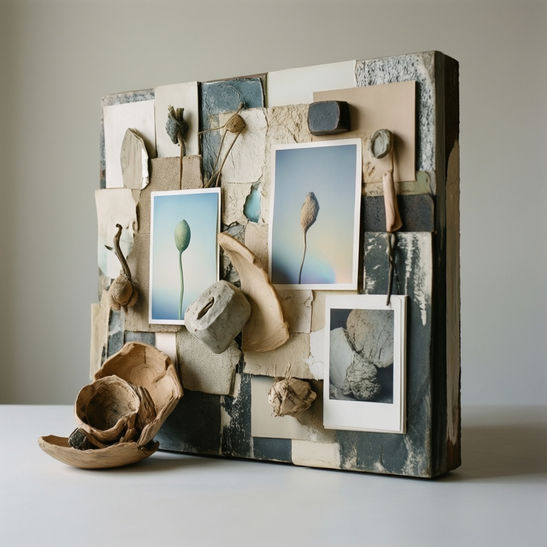 Mixed media artworks combining various materials and techniques. The collection displays innovative combinations of traditional and experimental art, creating textured and multi-dimensional pieces.